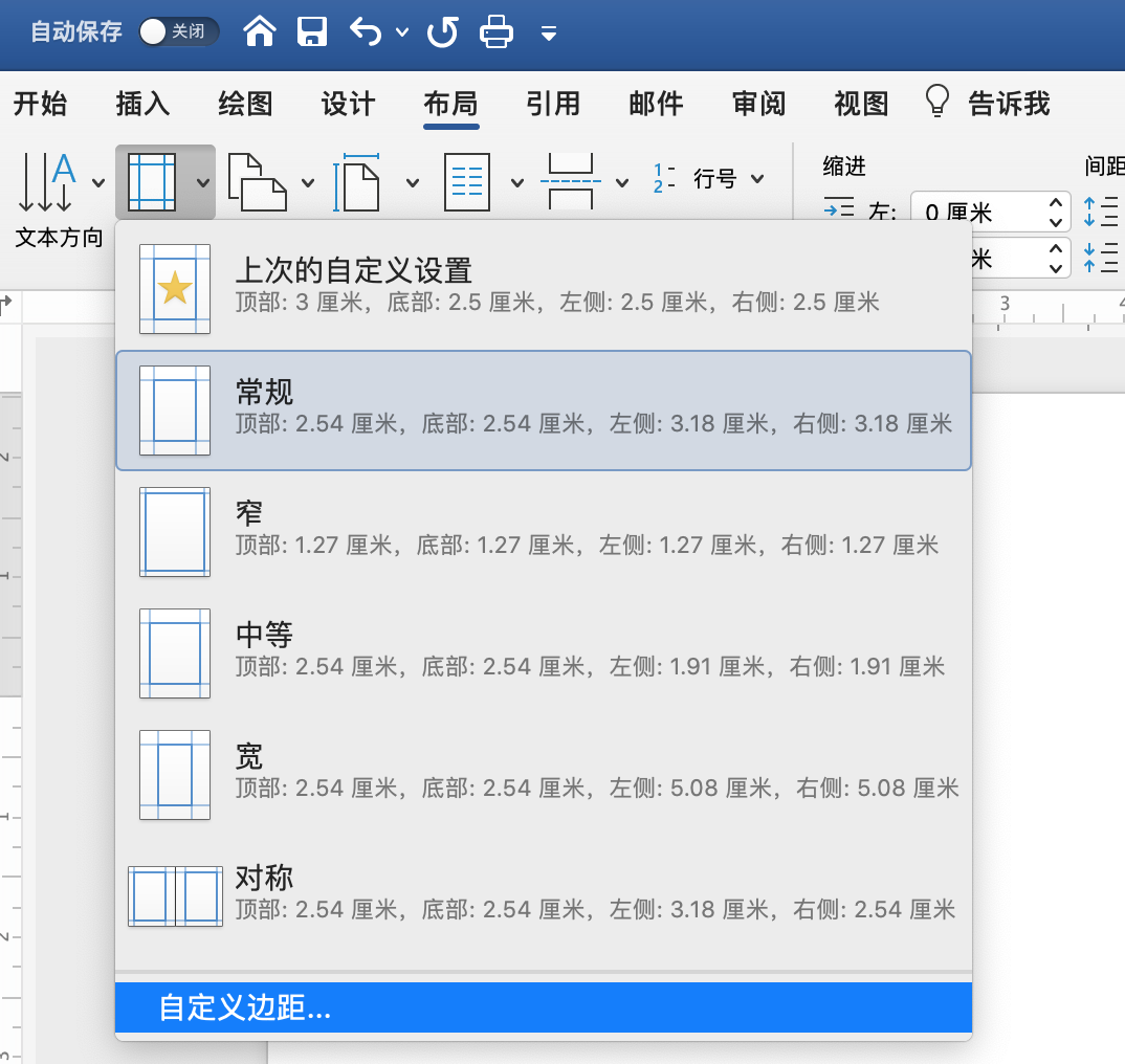 第二步:点击菜单栏中的“布局”按钮,然后在工具栏中点击“页边距”,选择“自定义页边距”。